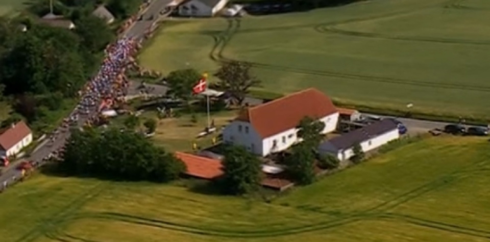 Her et luftfoto fra Tour de France 2022, hvor feltet kørte forbi ejendommen, hvor der var samlet omkring 150 glade mennesker