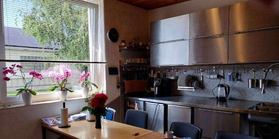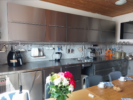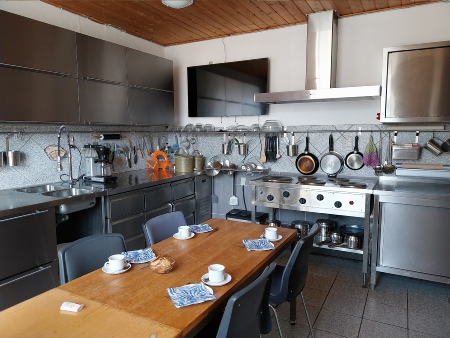 Køkkenet er et typisk landkøkken anno 2020’erne. Altså en mellemting imellem industrikøkken og privatkøkken med stort komfur og gedigne kølemøbler